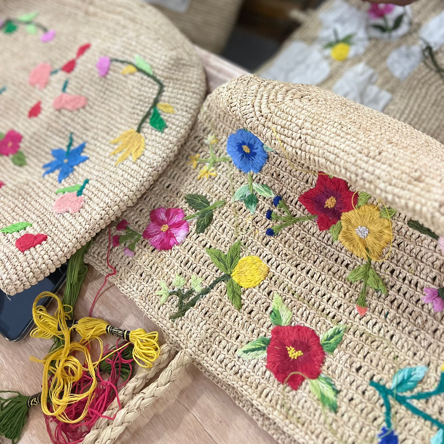 - Confections d’accessoires et finitions base raphia, réalisées à la main par nos artisans.