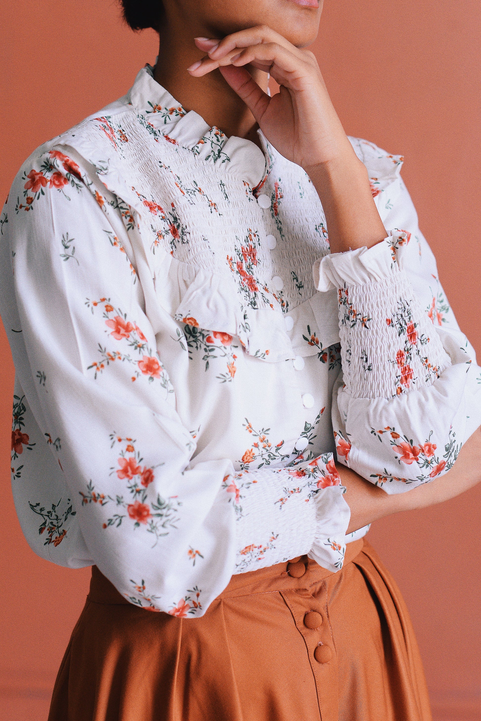 - Empiècement smocké sur la poitrine et aux poignets